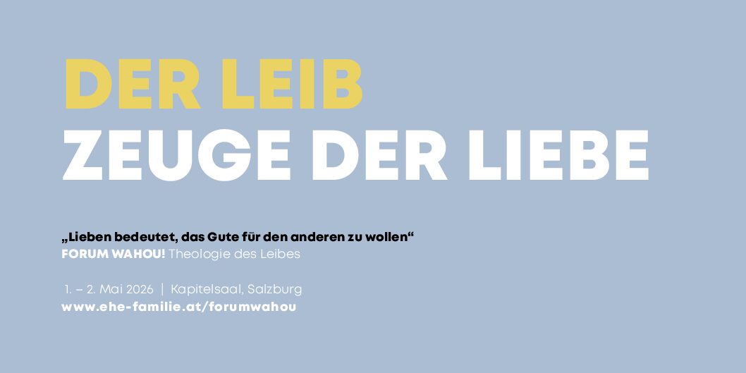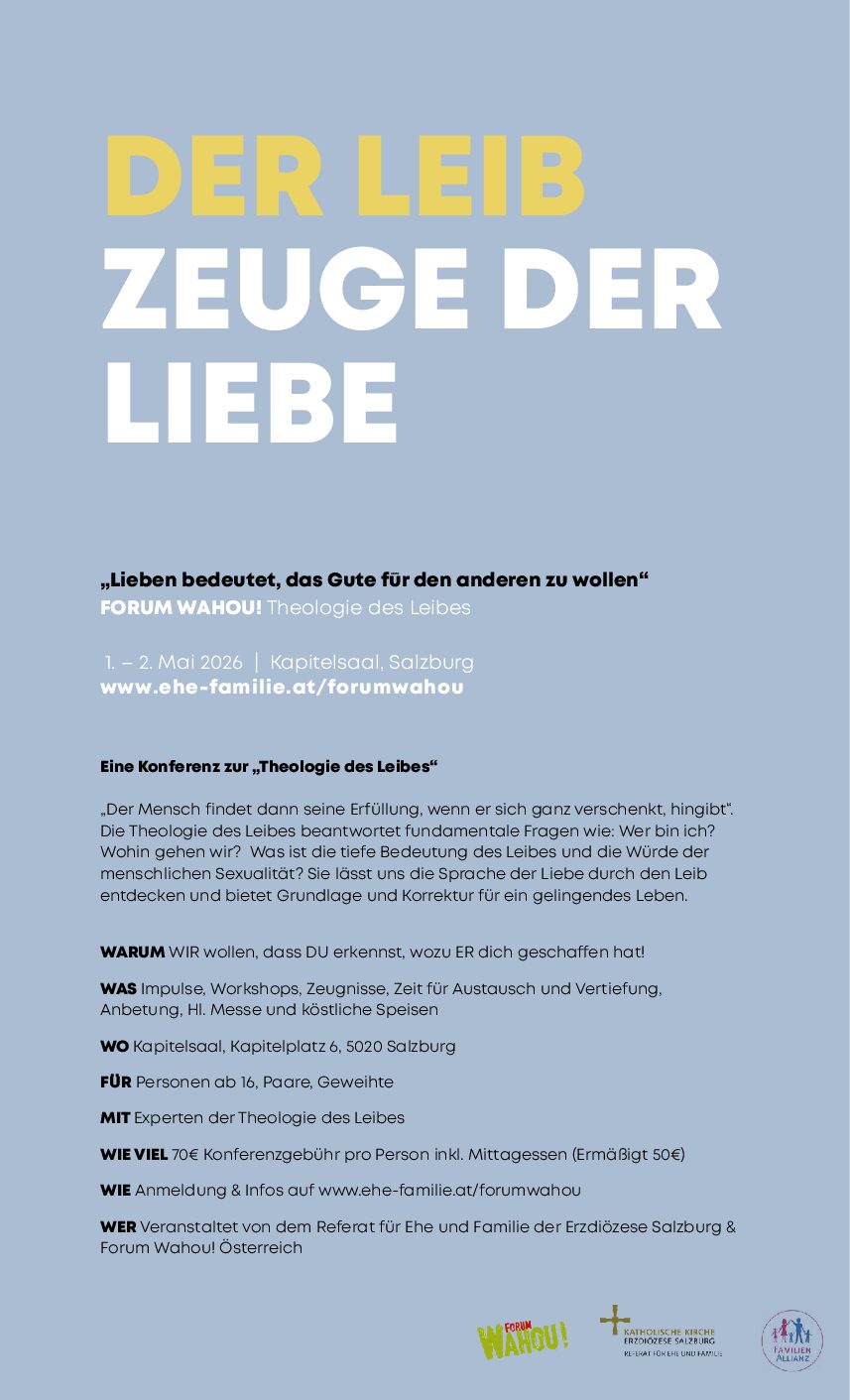 Nach mehreren Jahren veranstalten wir wieder ein FORUM WAHOU! in Salzburg. Am 1. und 2. Mai könnt Ihr vor Ort die Theologie des Leibes kennenlernen, auffrischen, vertiefen. Vorträge, Zeugnisse, Austauschgruppen und VIEL Zeit um ins Gespräch zu kommen mit anderen.